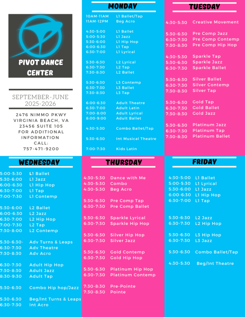 Dance with Me – 1-2 yrs old Combo – 3-4 yrs old Level 1 – 5-7 yrs old Level 2 – 8-11 yrs old Level 3 – 12-17 yrs old Adult– 18 and over 2025-2026 Class Schedule